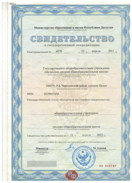 Адрес местонахождения образовательной организации* 368398, Республика Дагестан, Чародинский район, с. Цадах, ул.Т.Муслимова 38